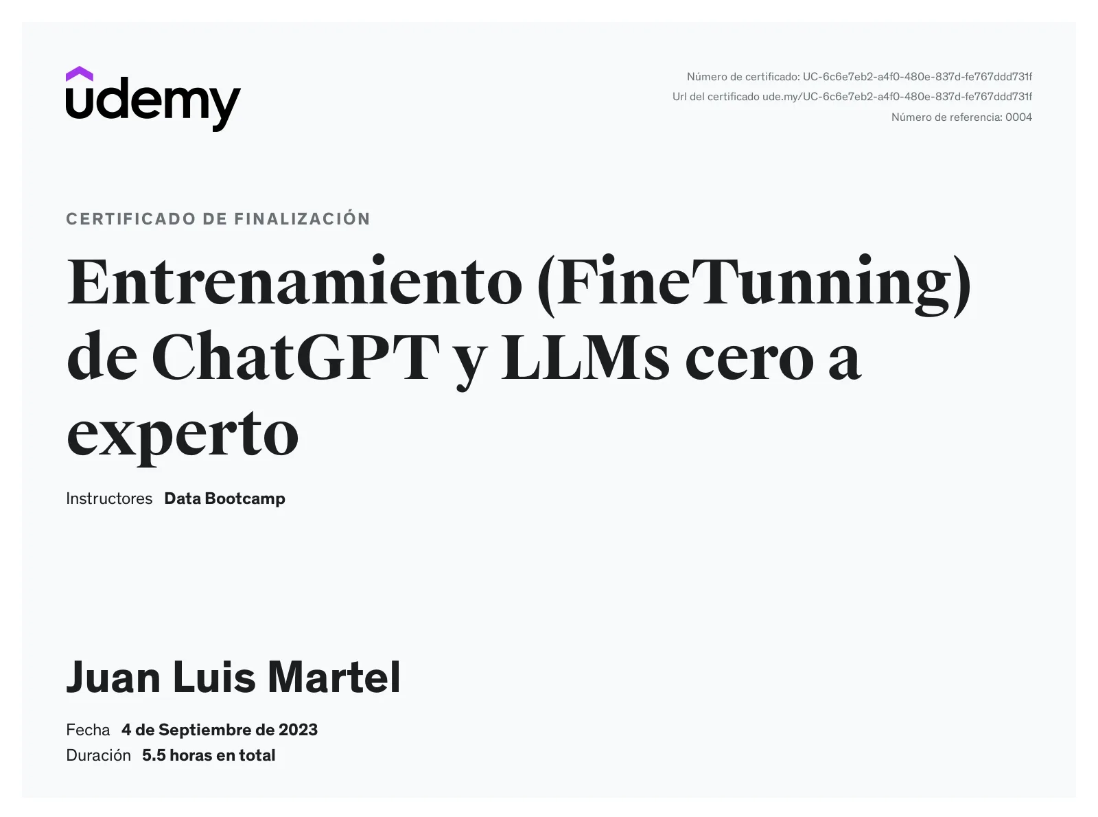 Sección titulada «Sobre el curso»Este curso exhaustivo enseña entrenamiento y fine-tuning de ChatGPT y modelos de lenguaje (LLMs) desde fundamentos hasta nivel experto, enfocado en aplicaciones empresariales prácticas. Aborda personalización de modelos para casos de uso específicos, permitiendo crear sistemas de IA altamente precisos y relevantes adaptados a necesidades particulares.