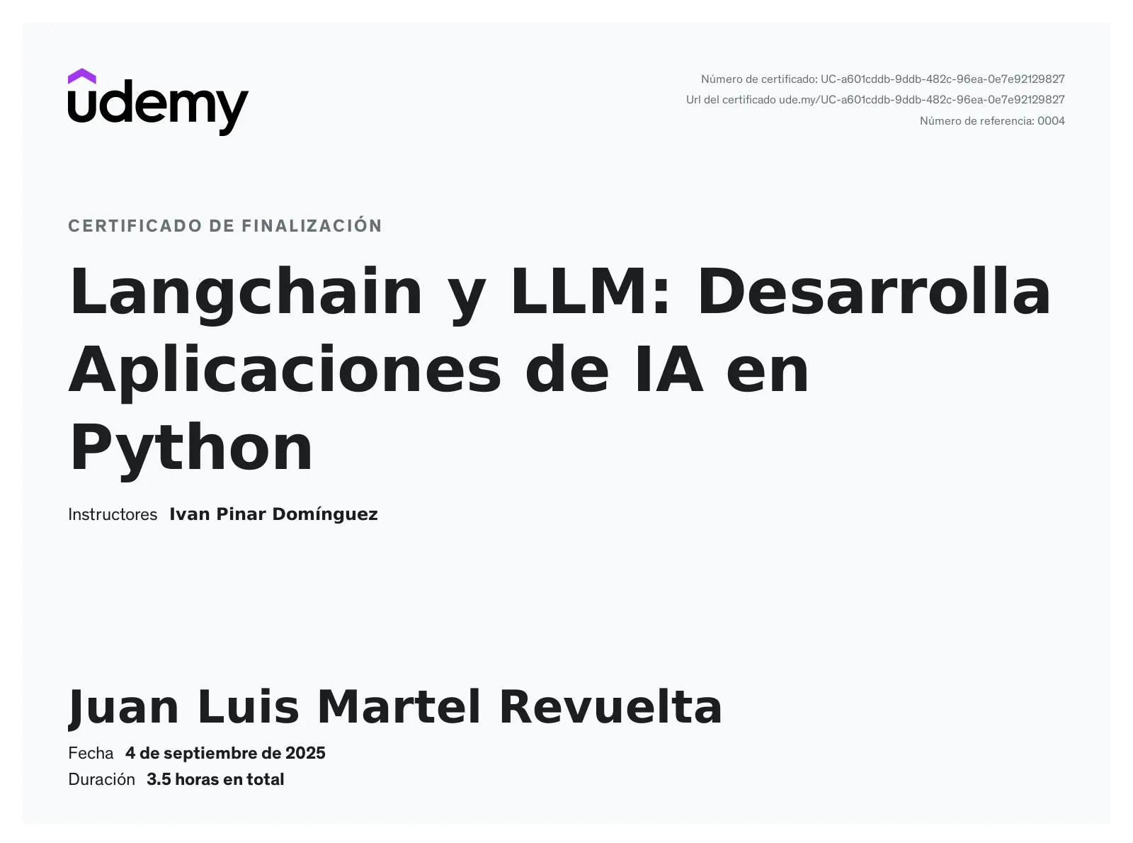Sección titulada «Sobre el curso»Este curso completo enseña desarrollo de aplicaciones de inteligencia artificial generativa mediante Langchain y Large Language Models (LLMs) con Python. Diseñado para equipar con herramientas y conocimiento necesarios para dominar integración de LLMs en aplicaciones, transformando interacción con datos y herramientas disponibles.