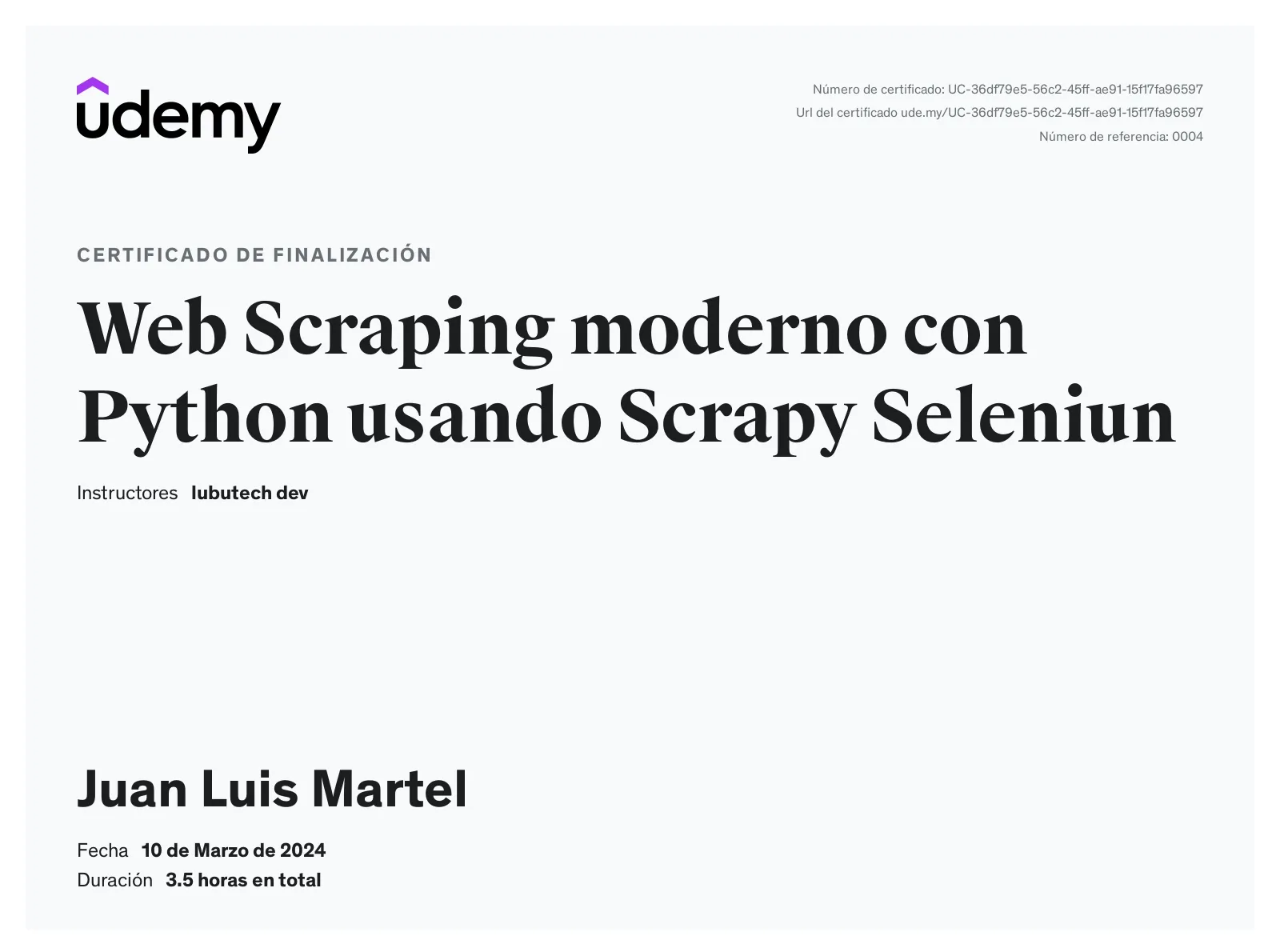 Sección titulada «Sobre el curso»Este curso enseña web scraping moderno y automatización de tareas mediante Python, utilizando herramientas profesionales como Scrapy y Selenium. Aborda soluciones prácticas a desafíos reales de extracción de datos de sitios web complejos, incluyendo creación de bots para plataformas como LinkedIn, Instagram y Google.