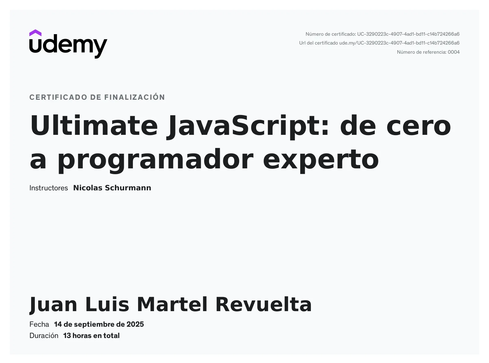 Sección titulada «Sobre el curso»Este curso completo y profundo enseña JavaScript desde nivel cero hasta conceptos avanzados con los que incluso programadores profesionales tienen dificultades. Impartido por Nicolás Schürmann con más de 10 años de experiencia desarrollando software para empresas internacionales, instructor con millones de estudiantes mundialmente y puntaje 4.7 en Udemy.
