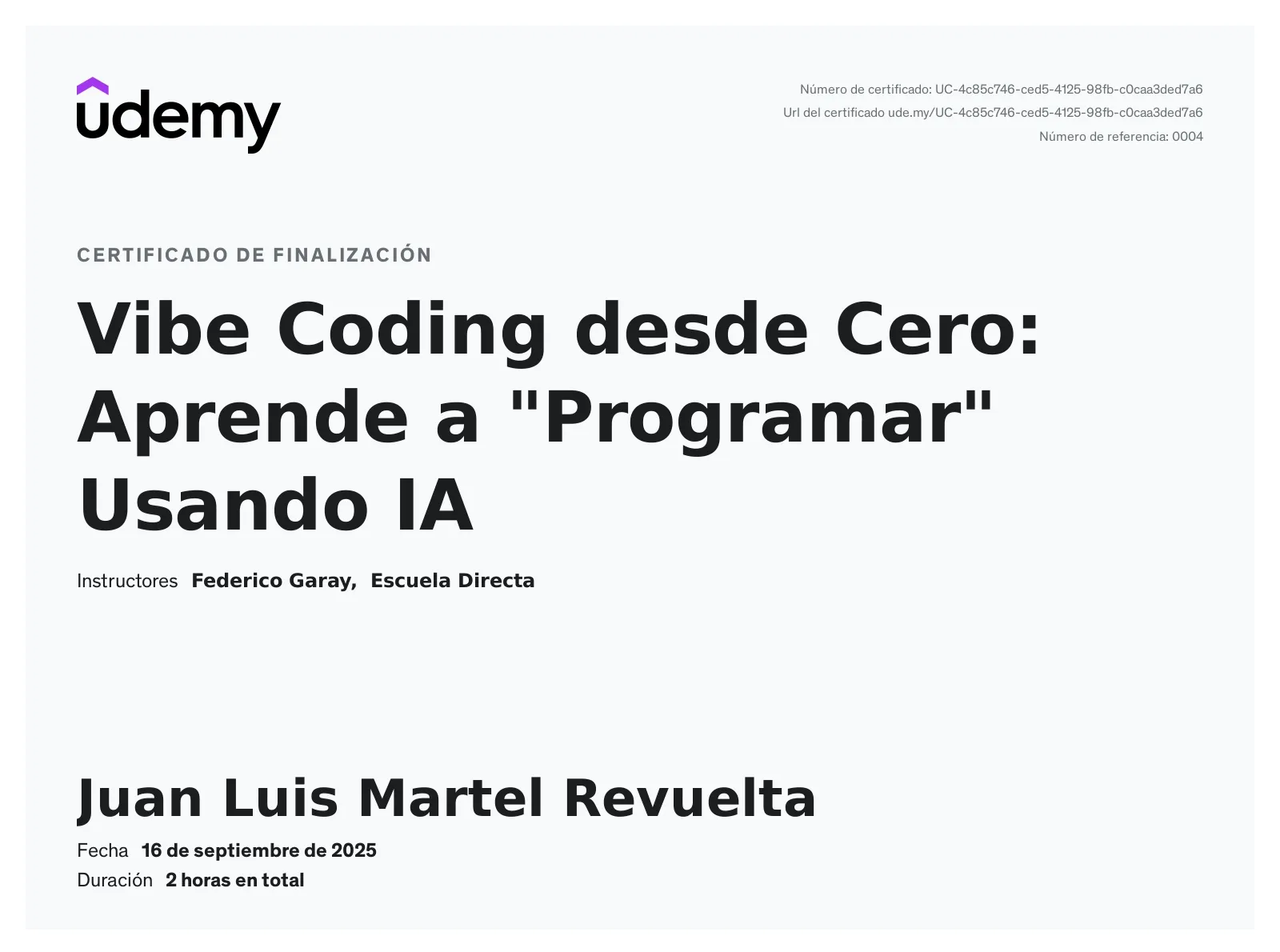 Sección titulada «Sobre el curso»Este curso enseña Vibe Coding, metodología revolucionaria que permite crear aplicaciones y websites completos sin escribir código manualmente, utilizando inteligencia artificial como co-piloto de desarrollo. Impartido por Federico Garay, VIP Instructor Partner en Udemy con mayoría de cursos best-sellers mundiales y cientos de miles de estudiantes en más de 50 cursos.
